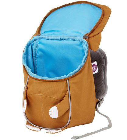 Affenzahn ryggsekken består av et stort rom som åpnes rundt undersiden av hodet med dobbelt glidelås. Vesken er lyseblå på innsiden.