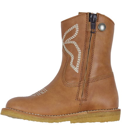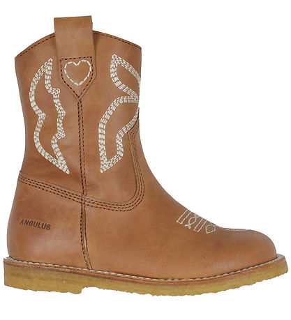 Vakre Angulus støvler i brun skinn, med dekorative sømmer i beige.