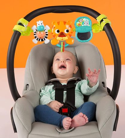 Fun Bright Starts barnevognskjede i turkis og oransje nyanser med en søt tiger i midten.