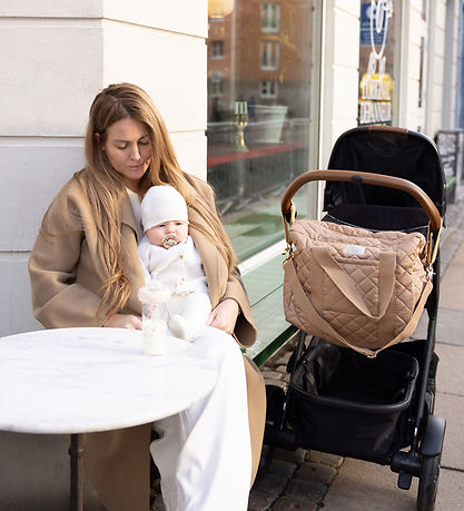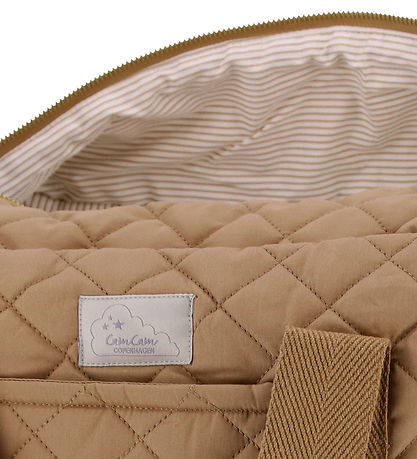 Vakker Cam Cam Copenhagen stellebag i lysebrun. Stellebagen har en quiltet struktur og den har gullfargede metallspenner og glidelås. Fôret er stripete i beige og kremhvit.