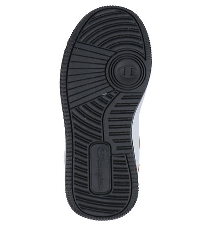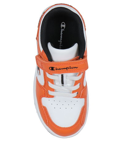Stilige Champion sko med imitert skinn overflate i hvit og oransje med logoer på siden og borrelåsstropp.