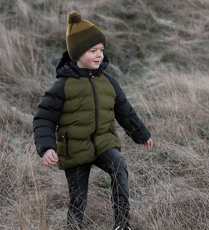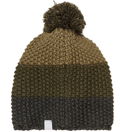 Flott Color Kids lue i lys, støvet grønn, mørkegrønn og mørkegrå i sterk, strikket kvalitet.