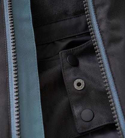 Vinterjakken åpnes foran med glidelås med hakebeskytter og innvendig vindstolpe. Foran er det en falsk klafflomme og glidelåslommer på sidene. I midjeåpningen er det en innsiden regulerbar elastisk kant, og det er også et smart snømansjetter med gummibelegg på innsiden og trykknapper.