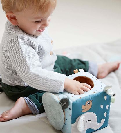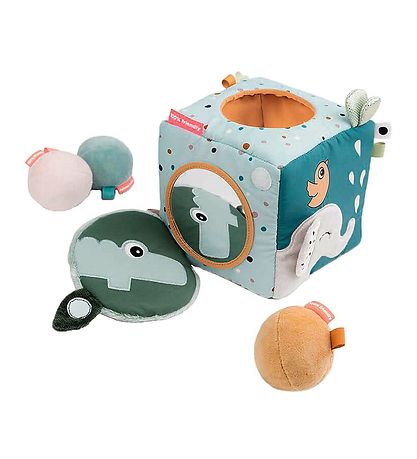 aktivitetsleken Done by Deer har en firkantet form, med mange morsomme og spennende aktiviteter, som f.eks knitrende papir, et baby speil og myke baller med rangler innsiden. Det er et hull på toppen slik at du også kan oppbevare verdisakene dine selv.