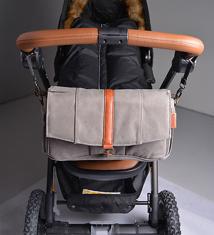 Flott Easygrow barnevognsbag i grå canvas og med detaljer i brunt imitert skinn og metall.
