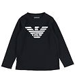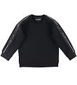 Fin Emporio Armani genser i svart, og nedover ermene er det brede, svarte strikker med en smal, hvit stripe og navnet "Emporio Armani" i hvit.