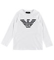 Emporio Armani genseren har et snitt som en collegegenser med lange ermer og brede kanter.