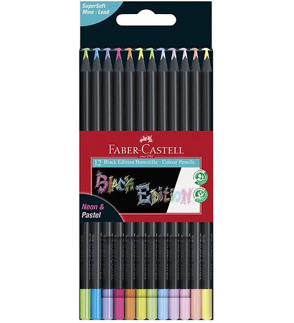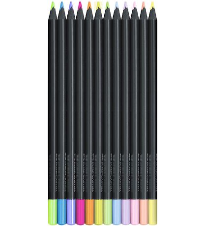 Gode Faber-Castell fargestifter selges i en 12-Pack i vakre neon og pastel. Fargeblyantene er svarte.