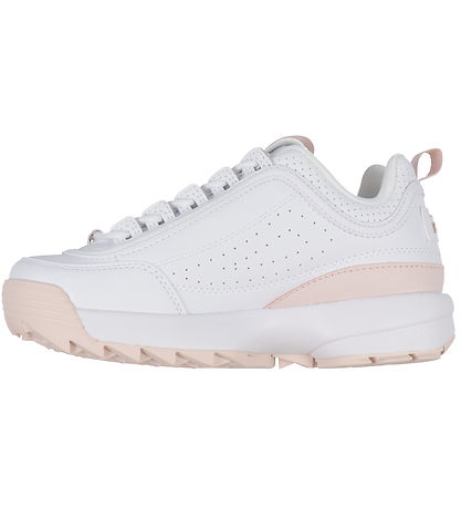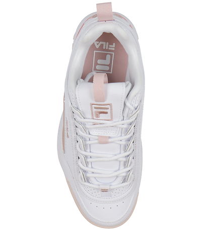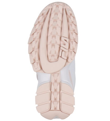 Vakre Fila sneakers i hvit imitert skinn med rosa detaljer. På utsiden av skoen, på hælen og på pløsen er en Fila logo brodert i rosa.