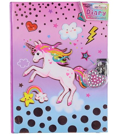 Hot Focus-dagboken inneholder 300 linjerede sider. Dagboken kan låses med en hengelås formet som et rosa hjerte med liten rhinestone.