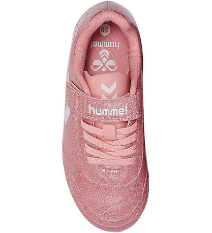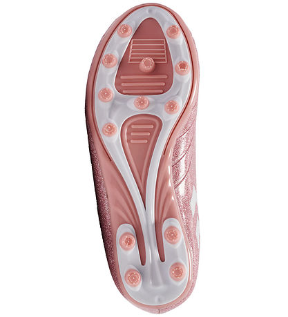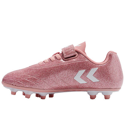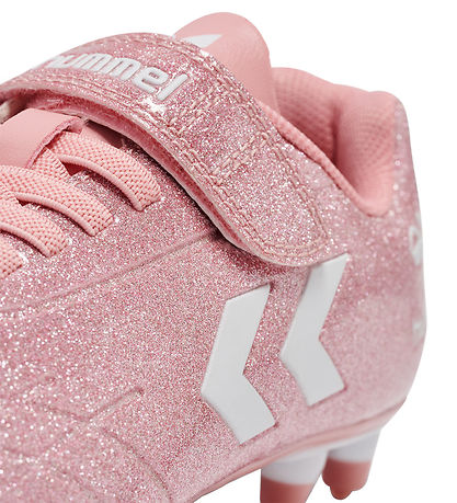 Kule Hummel fotballsko i rosa med sølv og rosa glitter. Fotballskoene har hvite logoer på sidene, hælen og pløsen.