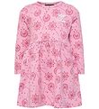 Smart Hummel kjole i navy med to brede striper øverst i rosa og hvit. Foran er det et brodert logotrykk i sølv med glitter, og ned på ermene er de klassiske Hummel vinkler.