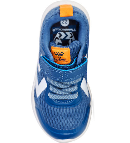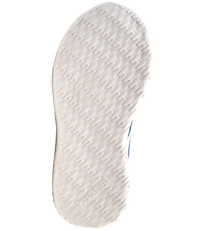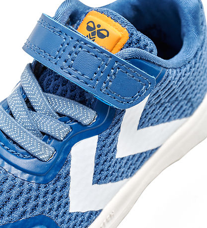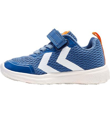 Vakre Hummel Sko i fargen blå mesh og gummibelegg. På ytre og innsiden er de karakteristiske vinkler i hvit. Øverst på pløsen er det et oransje klistremerke med Hummel- logo i blått, samt en oransje hælrem.