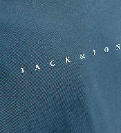 Vakker Jack & Jones t-skjorte i støvblå, og foran står det "Jack & Jones" med hvite gummibokstaver.