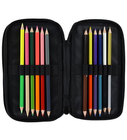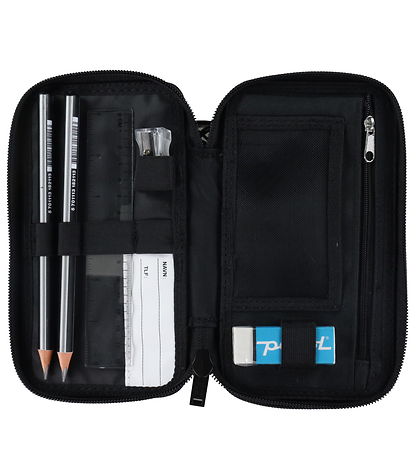 Penal har to Rum som begge åpnes med glidelås. Det ene Rum har navneskilt og mange elastiske stropper for å holde styr på de tolv tykke fargestifter. Det andre Rum har navneskilt, glidelåslomme og svart nettinglomme for skoleformen, samt elastiske stropper for å holde styr på viskelæret, blyantspisseren, linjalen og de to tykke blyantene.
