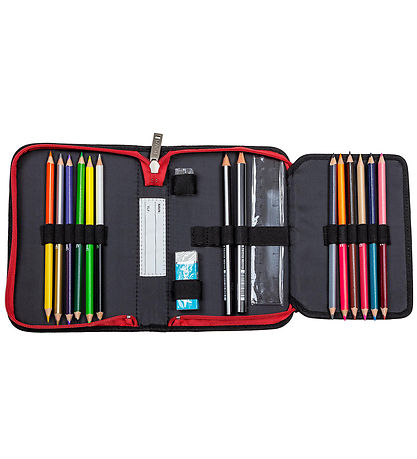Penal åpnes med glidelås og består av ett stort rom, som er delt med en funksjonell klaff. Rommet har navneskilt og mange elastiske stropper for å holde styr på skriveredskapene. Klaffen har glidelåslomme og svart nettinglomme for skoleformen på den ene siden.