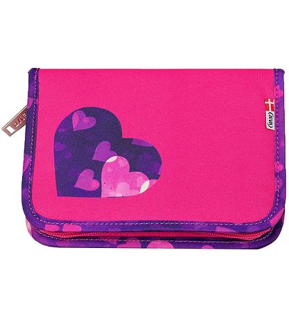 Vakker Jeva penal i rosa med kanter i lilla med hjerter på. På forsiden og bak er det et hjerte i lilla med mindre hjerter inni i rosa nyanser.