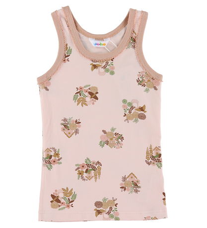 Vakker Joha undertrøye i lys rosa med et søtt trykk av fuglehus og blomster i brune, grønne og rosa nyanser.