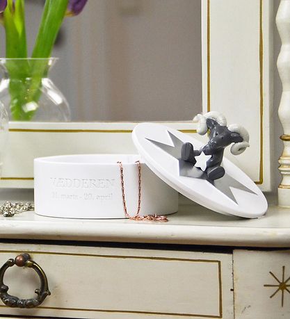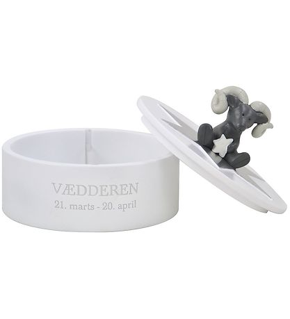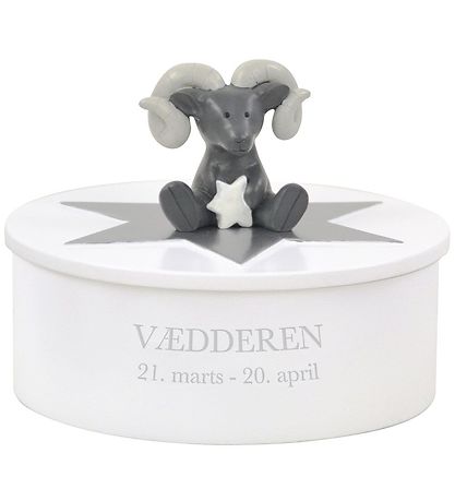 Vakker Kids by Friis smykkeskrin i hvit med stjernetegnet Væren. På toppen sitter en søt figur, som skal illustrere stjernetegnet, og figuren holder en stjerne som lyser i mørket. På forsiden er det skrevet "VÆREN" og dyrekretsen.