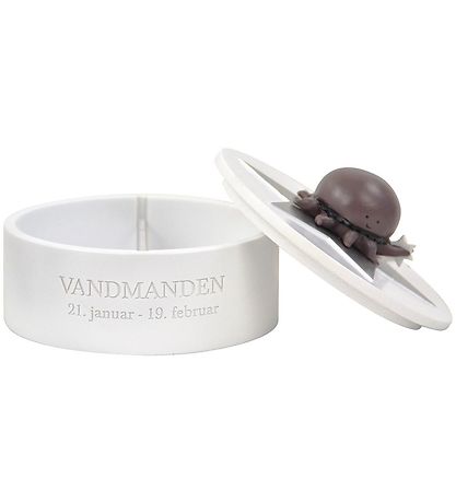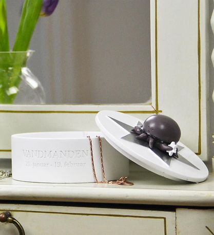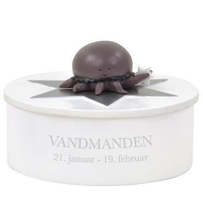 Vakker Kids by Friis smykkeskrin i hvit med stjernetegnet Aquarius. På toppen sitter en søt figur, som skal illustrere stjernetegnet, og figuren holder en stjerne som lyser i mørket. På forsiden er det skrevet "VANNMANN" og dyrekretsen.