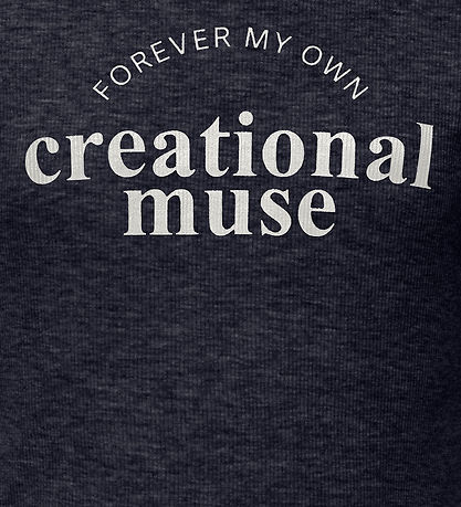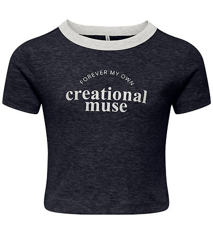 Vakker Kids Only t-skjorte i navy med hvit kant ved halsen. På brystet har t-skjorten et trykk med teksten «Forever My Own Creational Muse» i hvit, og den har en deilig ribbestruktur.
