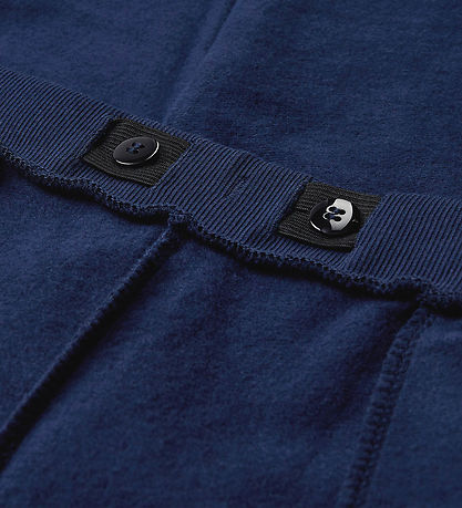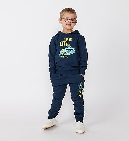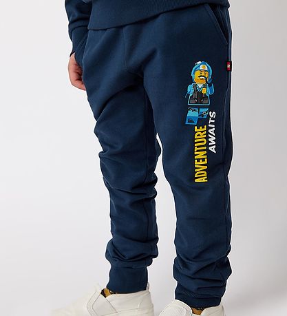 Fin LEGO® City joggebukse i navy, og på venstre bukseben er det en politimann trykket i fargen blå og gul, og under står det "Adventure Awaits" i gul og hvit.