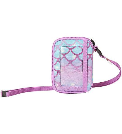 Smart LEGO® lommebok i nyanser av rosa og lilla, med et trykk på forsiden av en LEGO® havfrue. Overalt er det glitter og et trykk som ser ut som fiskeskjell.