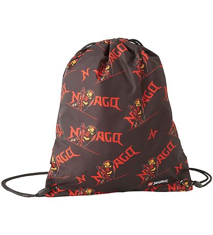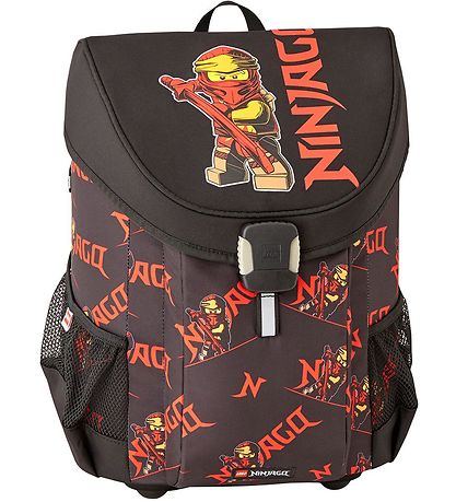 Kult LEGO® Ninjago skolesekk sett i svart, med et all-over trykk av den røde ninjaen og "Ninjago" i røde og gule nyanser. På toppen er den svart, med et stort trykk av den røde ninjaen og "Ninjago".