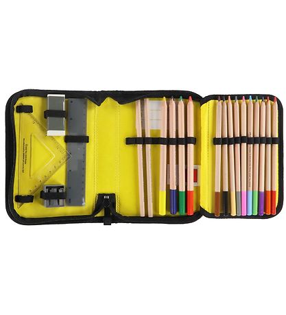 Skolesekken består av et stort rom med åpen lomme for bærbar PC eller nettbrett og nøkkelreim. Vesken åpnes øverst med stor klaff med praktisk klikkspenne. Skolesekken har et ergonomisk ryggpanel med justerbare skulderstropper som er polstret i mesh og en justerbar bryststropp. Penal har innhold, inkludert farger, blyanter, viskelær og blyantspisser.