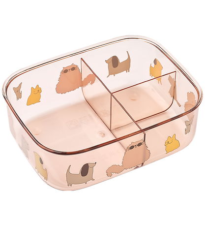 Flott Liewood matboks i gjennomsiktig plast med rosa overflate og beige silikonlokk, deler med trykk av hunder og trykk.