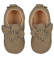 Melton krabbeskoene har hælreim og bred borrelåslukking over vristen, noe som gjør dem enkle å ta av og på. Innsiden er fôret med myk fleece og har en uttakbar innersåle. Under bunnen er det brunt semsket skinn, noe som gjør det lettere for barnet å stå Fast.