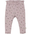 Komfortable bukser fra Minymo i en lys beige farge med vakre små rosa blomster. Stoffet har en strikket flott som gir et klassisk utseende. Minymo buksene har en elastisk midje som bidrar til en komfortabel passform. Beinkantene er avsluttet med rib, noe som sikrer at buksene sitter godt ved anklene.