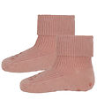 Minymo sokkene har gummiputer på toppen av foten og under bunnen, som sikrer et mer sklisikkert fotfeste. Sokkene er i en myk og tøybar kvalitet med en dekorativ sløyfe i benåpningen.