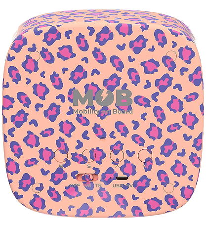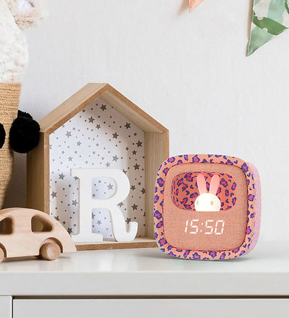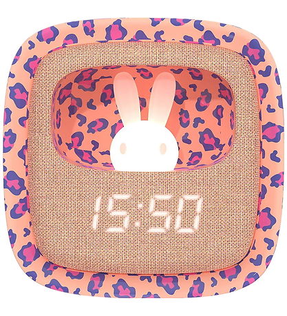 Smart Mobility On Board-vekkerklokke med nattlys i rosa med leopard mønster i fargen blå og rosa. Vekkerklokken er laget av silikon og tekstil, slik at det ser ut som om nattelampen, som er laget som den hvite kaninen Billy, ligger og koser i en seng.