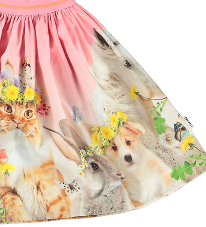 Flott Molo skjørt i rosa nyanser og med fargerikt trykk av kjæledyr, blomsterkranser og sommerfugler på skjørtet.
