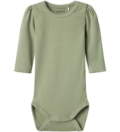 Deilig Name It body i en støvet grønn nyanse med lange ermer og fine detaljer ved hals og ermer. Bodyen har en enkel design, perfekt for små barna og sikrer en behagelig passform hele dagen.