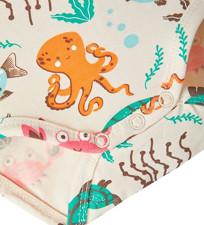 Name It bodyene har lange ermer og rund hals. Det er smale ribbekanter i hals og benåpningene, og bodyen åpnes med praktiske trykknapper på venstre skulder og mellom bena.