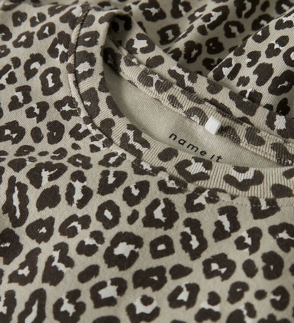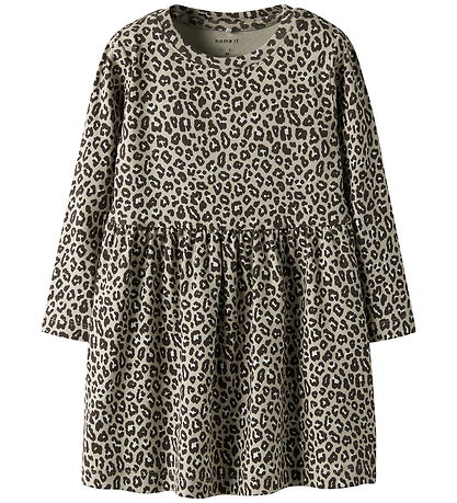 Stilig Name It kjole i beige med et spennende leopardmønster i brun og hvit. Name It kjolen har lange ermer og rund halsutringning. Kjolen er designet med en midjelinje som gir en lett rysjeeffekt i skjørtet.
