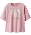 Nydelig Name It t-skjorte i en vakker rosa farge. T-skjorten har et trykk og teksten «Miami Long Beach State of Florida» i hvite og oliven nyanser.