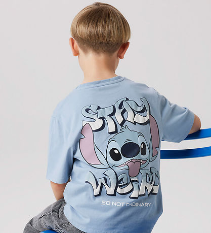 Stilig Name It t-skjorte i en støvet lyseblå farge med et sjarmerende trykk med et vakker trykk av Stitch og teksten «So Not Ordinary», som gir et unikt preg. På Bak er det et stort trykk av Stitch og teksten «Stay Weird».