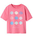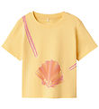 Nydelig Name It t-skjorte i gul med et herlig trykk i rødlige nyanser av et skjell, med stropper slik at den ser ut som en veske.