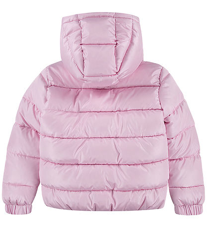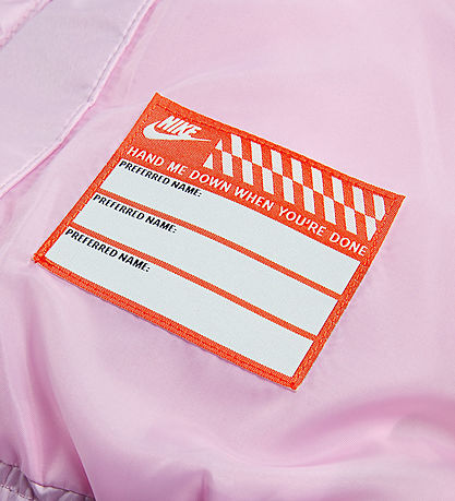 Fin Nike polstret jakke i rosa med brodert, hvit logo på venstre bryst og skråstilte sømmer.