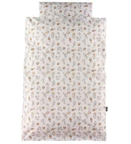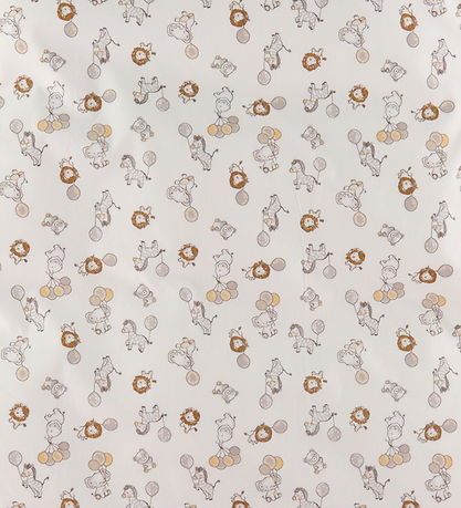 Pent Nørgaard Madsens sengetøy i hvit med et søtt allovertrykk av små løver, elefanter og sebraer som holder vakre ballonger i nyanser av beige, gult og grå.