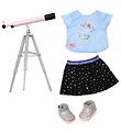 Settet består av en vakker blå t-skjorte med volangermer, Spencer-kjole og sko, samt tilbehør til reisen i form av togbillett og nakkepute.