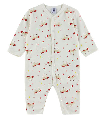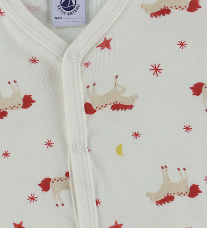 nattdrakten fra Petit Bateau har lange ermer og ben, og den har smale ribbekanter i bein og ermeåpningene. Den kan åpnes foran med gjennomgående trykknapper og mellom bena med ekstra trykknapper.