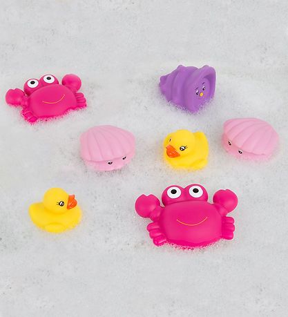 Fin Playgro badeleke bestående av 7 sjødyr i gul, rosa og lilla.