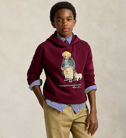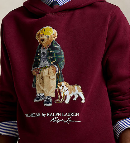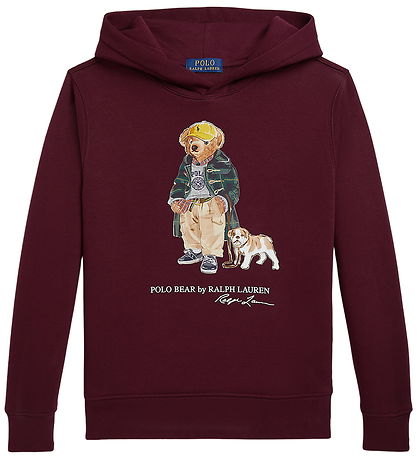 Elegant Polo Ralph Lauren hettegenser i bordeaux genser med et sjarmerende Polo Bear trykk foran. Trykket viser bjørnen iført klær og en lue, og en liten hund ved siden av. Hettegenseren har en klassisk passform med lange ermer og en komfortabel hette. Ribbekanter på ermene og i midjen fullfører designet. Det er diskrete lommer på sidene, og hettegenseren har myk, børstet bomull på innsiden. Navnet Polo Ralph Lauren er stilig lagt til under bjørnen.
