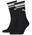 Søte Puma sokker i 2-pack i hvit og svart med logoer i henholdsvis svart og hvit, og de har en bølget toppkant. Når toppkanten brettes over, avsløres en diskret glitterstriper på innsiden.