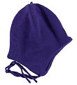 Deilig Reima lue med bred, lys lilla stripe nederst, striper i lys og mørkrosa og mørkelilla dusk øverst. Luen har en strikket ribbestruktur.