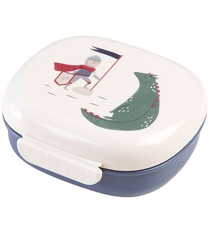 Cool Sebra matboks i fargen blå med hvit lokk med illustrasjon av en drage og en ridder.